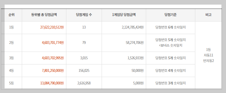무려 13명의 1등 당첨자가 나왔고요, 각자에게 돌아가는 당첨금은 약 21억 2,478만 원이에요!