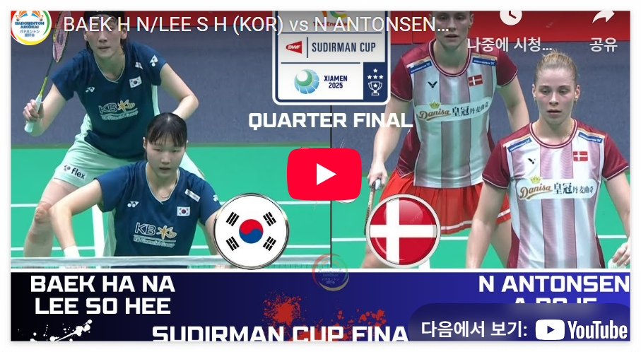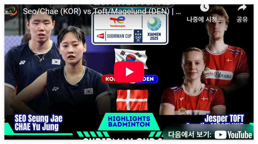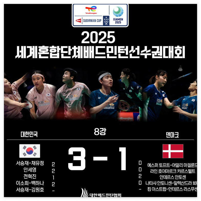 2025년 5월 2일 중국 샤먼, 한국 배드민턴 대표팀이 덴마크를 3-1로 제압하고 세계혼합단체전 ‘수디르만컵’ 4강 진출을 확정했습니다!