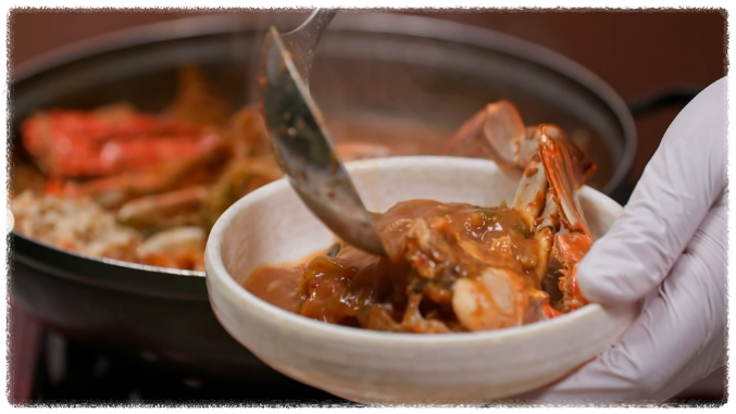 꽃게와 묵은지, 된장·고추장 육수가 어우러져 김치찌개 + 꽃게탕 + 해장국이 합쳐진 듯한 얼큰하고 구수한 국물 맛!
